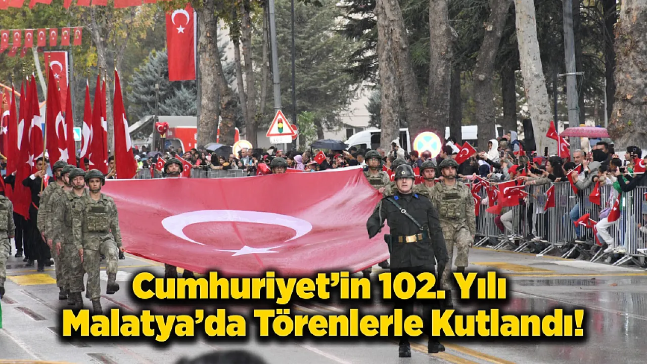 Cumhuriyet Bayramı'nın 102. yılı Malatya'da yoğun yağışa rağmen coşkuyla kutlandı. Törenlerde askeri geçit, halk oyunları ve çocuk gösterileri büyük ilgi gördü.