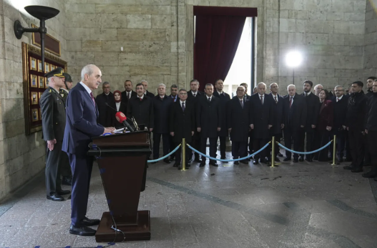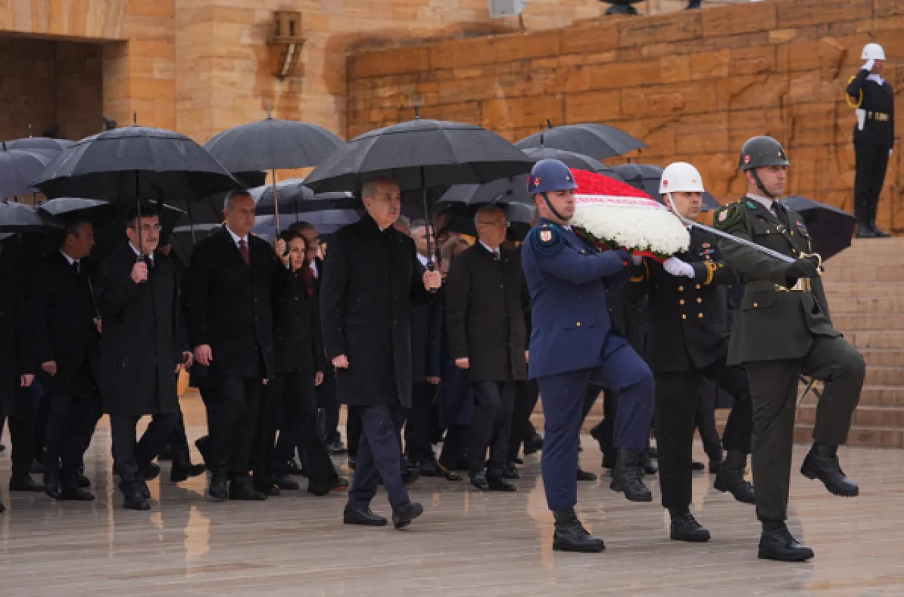 Aslanlı Yol üzerinden yürüyerek Ata’nın huzuruna çıkan heyet, mozoleye çelenk sunarak saygı duruşunda bulundu. Anıtkabir’deki törene Cumhurbaşkanı Yardımcısı Cevdet Yılmaz, CHP Genel Başkanı Özgür Özel, İYİ Parti Genel Başkanı Müsavat Dervişoğlu, bakanlar ve çok sayıda siyasi temsilci katıldı. Törenin ardından mozole merdivenlerinde günün anısına hatıra fotoğrafı çektirildi.