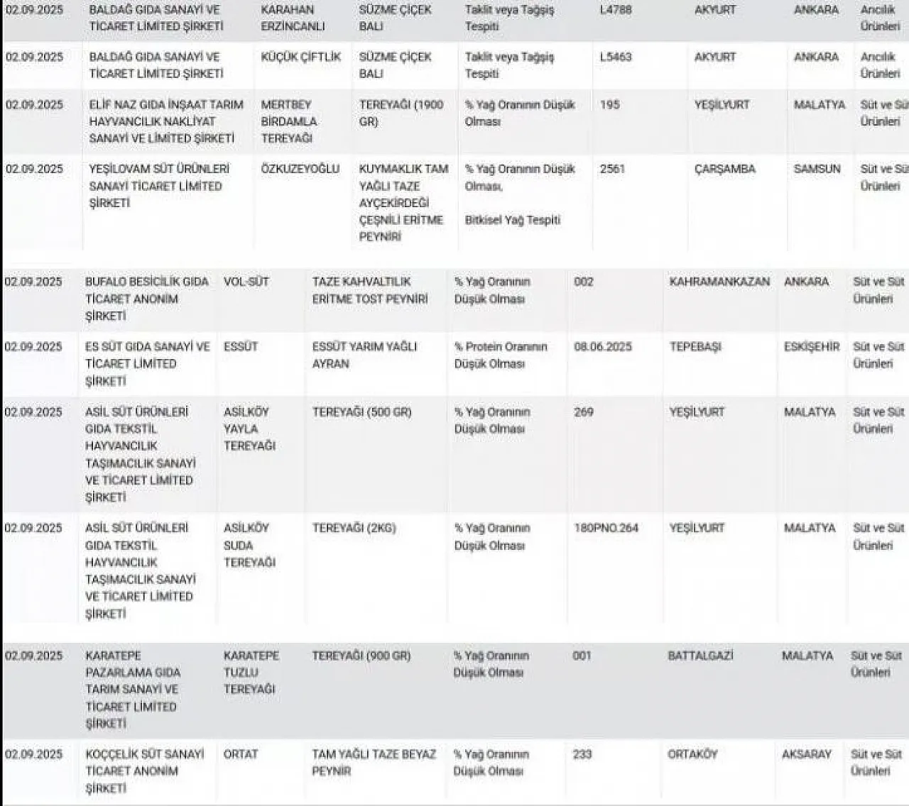 Tarım ve Orman Bakanlığı'nın Türkiye genelinde yürüttüğü gıda denetimleri sonucunda yayımlanan yeni taklit ve tağşiş listesinde Malatya'dan 4 farklı tereyağı firması yer aldı. Denetimlerde, bu firmalara ait ürünlerin yağ oranlarının olması gereken seviyenin altında olduğu tespit edildi.