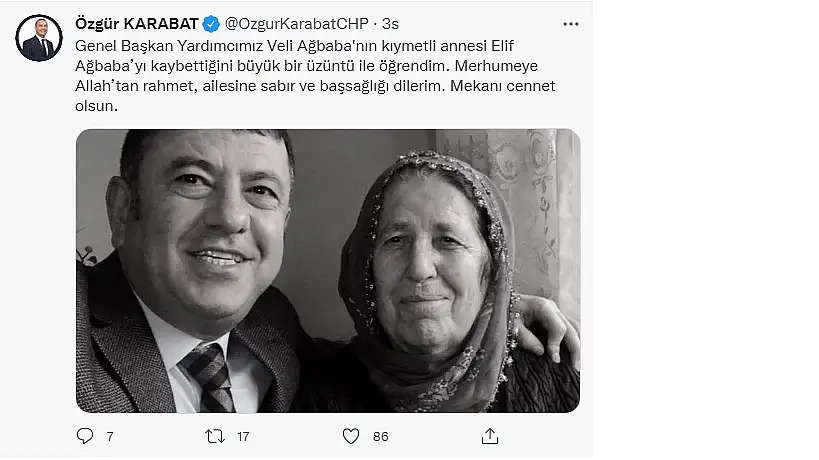 Karabat yayımladığı mesajında; “Genel Başkan Yardımcımız Veli Ağbaba'nın kıymetli annesi Elif Ağbaba’yı kaybettiğini büyük bir üzüntü ile öğrendim. Merhumeye Allah’tan rahmet, ailesine sabır ve başsağlığı dilerim. Mekanı cennet olsun.” ifadelerine yer verdi.