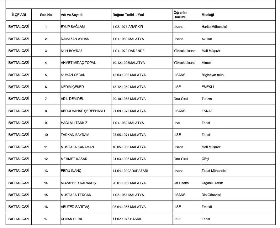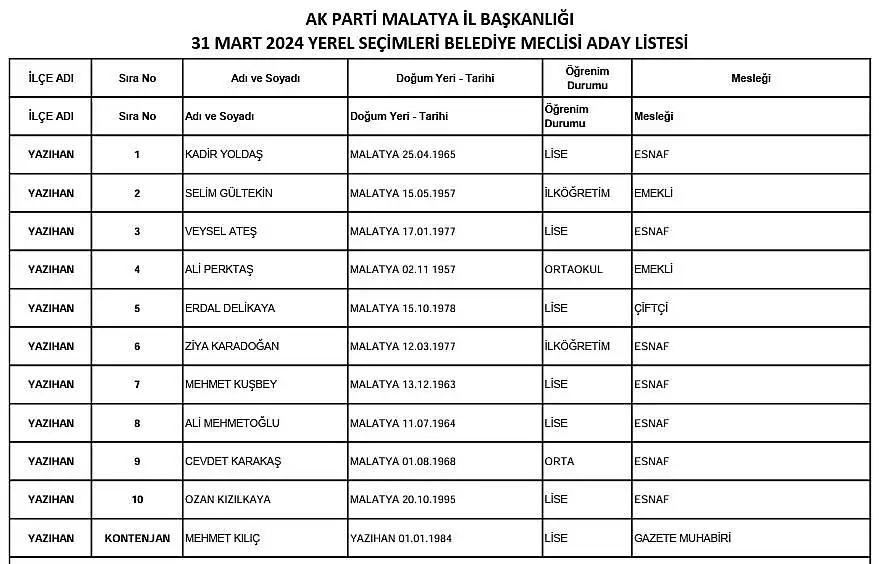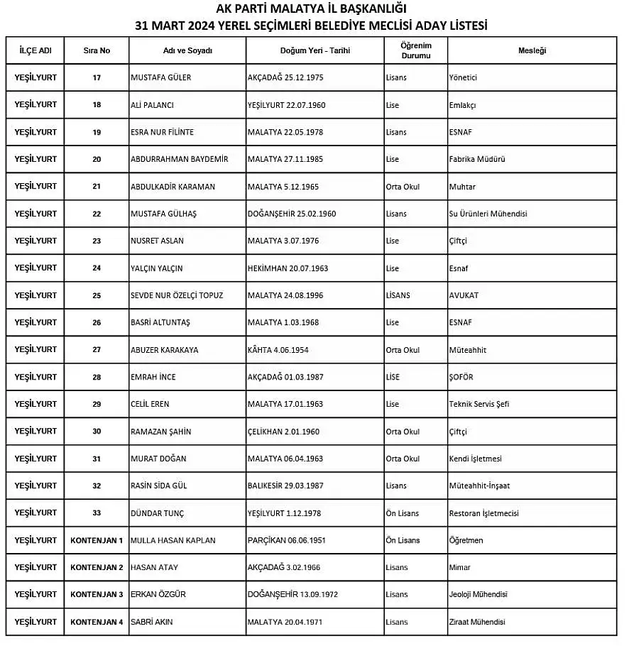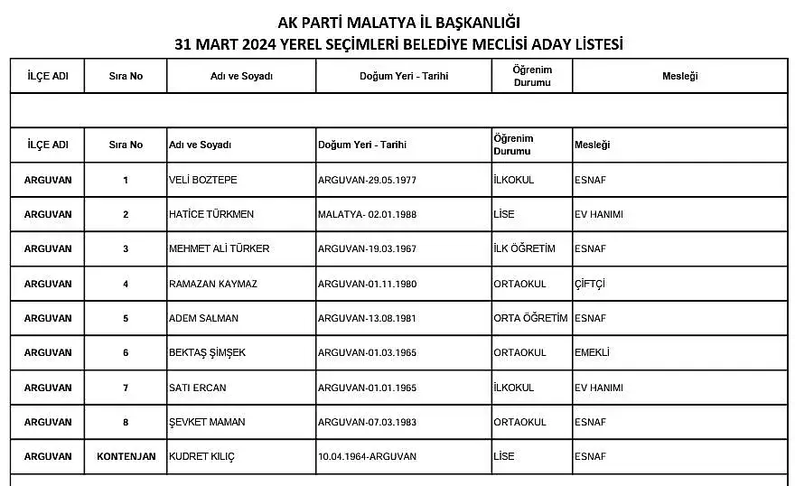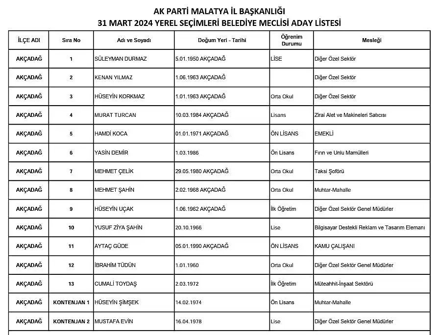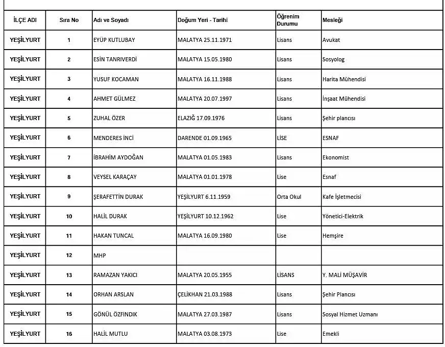 Cumhur İttifakında MHP'ye bırakılan Hekimhan ve Kuluncak dışında AK Parti'nin Malatya'daki 11 ilçesinde meclis üye adayları belli oldu.