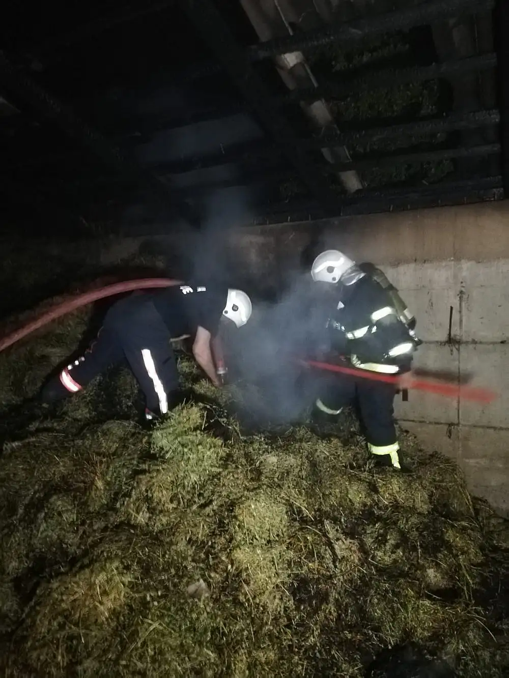 Yangında yaklaşık 2 ton yonca yanarken, ahırın çatı kısmında maddi hasar oluştu.