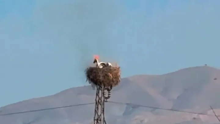 Malatya'nın Kale ilçesinde bir elektrik direği üzerindeki leylek yuvasında yangın çıktı. Çıkan yangında anne leyleğin yavrularını kurtarma çabası ise cep telefonu kameralarına yansıdı.