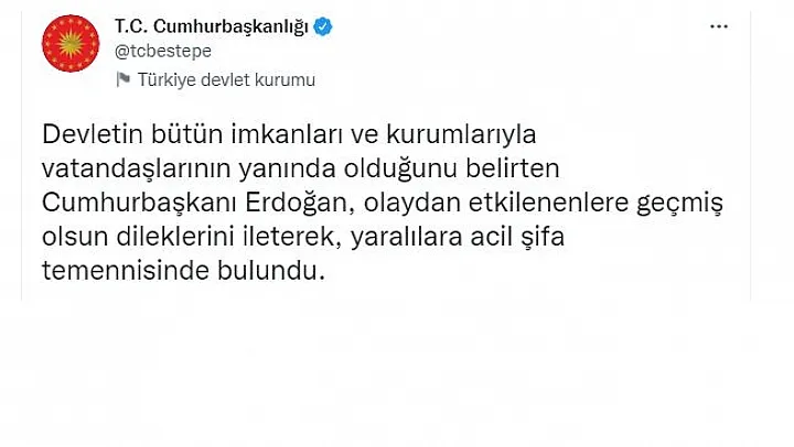 Devletin bütün imkanları ve kurumlarıyla vatandaşlarının yanında olduğunu belirten Cumhurbaşkanı Erdoğan, olaydan etkilenenlere geçmiş olsun dileklerini ileterek, yaralılara acil şifa temennisinde bulundu.