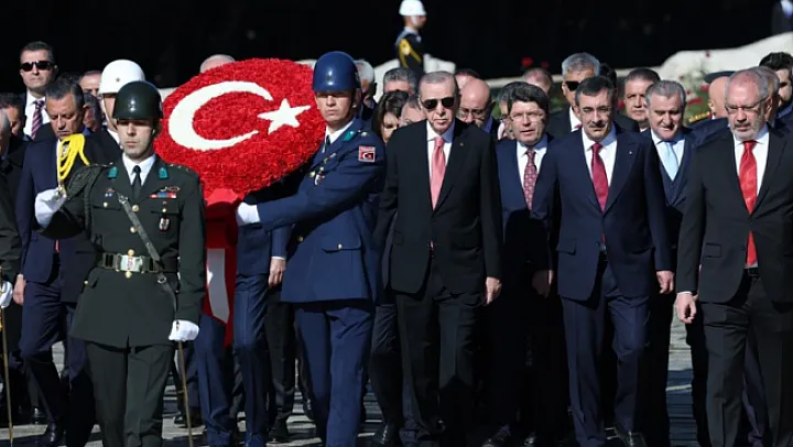 Cumhurbaşkanı Erdoğan'ın üzerinde ay yıldız bulunan çelengi Atatürk'ün mozolesine bırakmasının ardından saygı duruşunda bulunuldu ve İstiklal Marşı okundu.