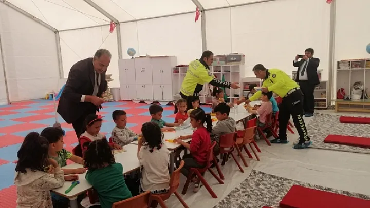 Malatya'da polis tarafından depremzede öğrencilere trafik kuralları ve güvenliği eğitimi verildi.