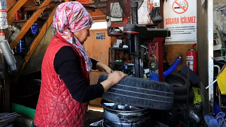 Antalya'nın Muratpaşa ilçesinde yaşayan Mümine Kökçe, 'erkek işi' olarak görülen kalıpları yıkarak 30 yıldır lastik tamirhanesinde ter döküyor. Eşiyle omuz omuza başladığı bu serüvende, son 8 yıldır bizzat lastik söküp takan, yama yapan ve ağır işlerin altından kalkan Kökçe, titiz işçiliğiyle hem mahallelinin hem de çevre esnafın takdirini topluyor.