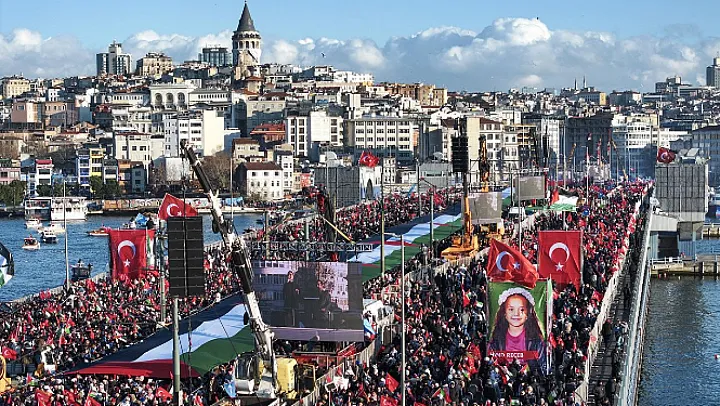 Türkiye Gençlik Vakfı (TÜGVA) öncülüğünde, İnsanlık İttifakı ve Milli İrade Platformu çatısı altında düzenlenen etkinlikte, 'Sinmiyoruz, susmuyoruz, Filistin'i unutmuyoruz' sloganı öne çıktı. Ayasofya-i Kebir Cami-i Şerifi, Sultanahmet Camisi, Eminönü'ndeki Yeni Cami, Fatih ve Süleymaniye camilerinin önünde toplanan kalabalık, sloganlar ve tekbirler eşliğinde Galata Köprüsü'nde buluştu.