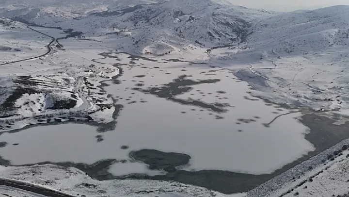 Sivas merkeze bağlı Yıldız beldesinde akşam saatlerinde hava sıcaklığının sıfırın altında 10 derecelere kadar düşmesiyle Yıldız Göleti'nin yüzeyi buzla kaplandı. Buzla kaplanan gölet dron ile görüntülendi.