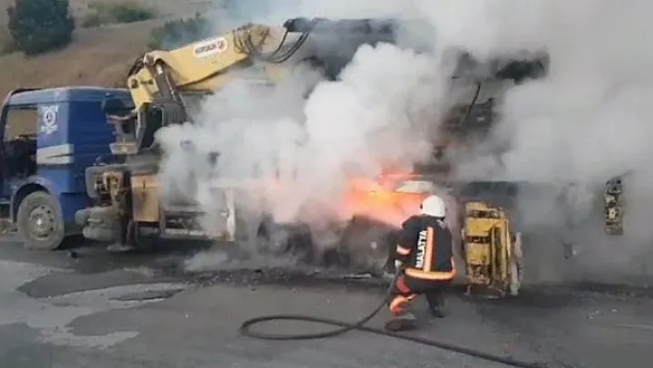 Edinilen bilgilere göre, Malatya istikametine seyir halinde olan iş makinesi taşıyan çekicinin dorsesin de henüz bilinemeyen bir nedenden dolayı yangın çıktı. Yangını fark eden sürücü aracı yol kenarına çekerek itfaiye ekiplerine haber verirken, kısa sürede olay yerine intikal eden ekipler yangını kontrol altına alarak söndürdü.