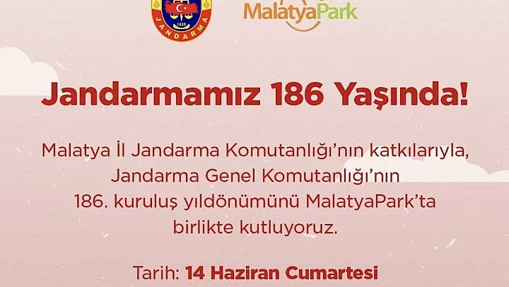 Jandarma teşkilatının tanıtımına yönelik düzenlenecek etkinliğe tüm halk davet edilirken, Malatya İl Jandarma Komutanlığı tarafından yapılan açıklamada, 'Kuruluşumuzun 186'ncı yıl dönümünde vatandaşlarımızla bir araya gelmekten onur duyacağız. Tüm hemşehrilerimizi standımıza bekliyoruz' ifadelerine yer verildi.