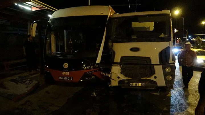 Malatya'da kontrolden çıkan beton mikserinin trambüse çarptığı kazada 4 kişi yaralandı.