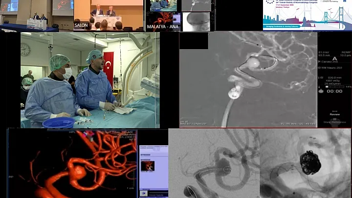 Toplantıya katılan İnönü Üniversitesi Tıp Fakültesi Girişimsel Nöroradyoloji Ünitesi'nden Prof. Dr. İsmail Okan Yıldırım ve Doç. Dr. Ahmet Turan Kaya'nın öncülüğündeki ekip, beyin baloncuğu tedavisini kapalı yöntemle canlı yayında gerçekleştirdi. Beyin Cerrahisi Anabilim Dalı'ndan Doç. Dr. Bora Tetik'in de yer aldığı operasyon, farklı ülkelerden gelen bilim insanları tarafından ilgiyle takip edildi.