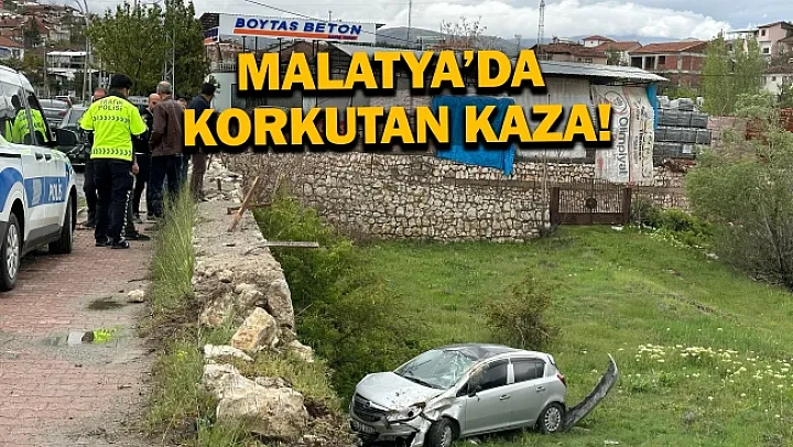 Malatya'da sürücüsünün kontrolünden çıkan otomobil, istinat duvarına çarparak bahçeye uçtu. Kazada 2 kişi yaralandı.