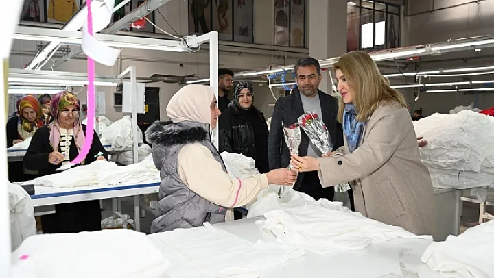 Hatunsuyu Mahallesi'nde Tekstil Kent'te çalışan kadınlarla bir araya gelen Milletvekili Ölmeztoprak, kadınlara karanfil dağıtarak günlerini kutladı.
