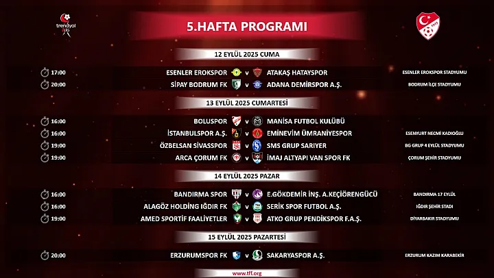 Türkiye Futbol Federasyonu (TFF), Trendyol 1. Lig'in 5, 6, 7, 8 ve 9. haftalarında oynanacak maçların programını kamuoyuyla paylaştı. Açıklanan takvime göre futbolseverleri birbirinden heyecanlı mücadeleler bekliyor.