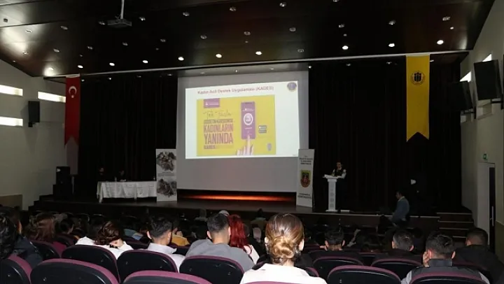 Malatya İl Jandarma Komutanlığı Aile içi Şiddetle Mücadele ve Çocuk Kısım Amirliği ekiplerince İnönü Üniversitesi'nde öğrencilerine KADES uygulaması anlatıldı.