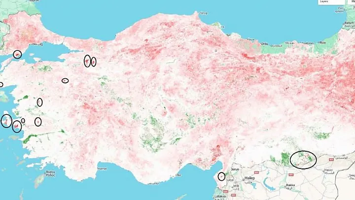 Prof. Dr. Kutoğlu, Haziran ve Ağustos aylarına ait uydu verilerini karşılaştırarak Türkiye genelindeki bitki örtüsündeki değişimi analiz etti. Yakın kızılötesi ve kısa dalga kızılötesi bantlar kullanılarak yapılan sınıflandırmada, beyaz alanlar nötr bölgeleri, pembe ve kırmızı tonlar ise bitkilerin su stresine girdiği kurak alanları gösterdi. Koyu kırmızı bölgeler ise yangın nedeniyle bitki örtüsünün tamamen yok olduğu alanları temsil ediyor.