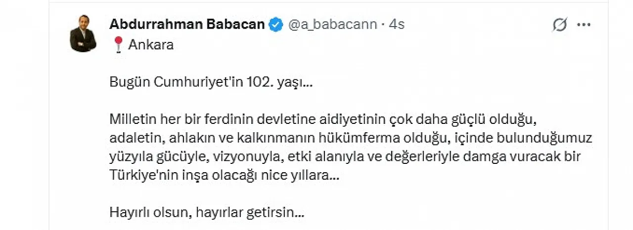 Babacan mesajında şu ifadeleri kullandı: “Bugün Cumhuriyet'in 102. yaşı... Milletin tüm bireylerinin devletiyle bağının daha da pekiştiği, adaletin, ahlakın ve kalkınmanın ön planda olduğu, içinde bulunduğumuz yüzyıla gücü, vizyonu, etkisi ve değerleriyle yön verecek bir Türkiye’nin inşa olacağı nice yıllara... Hayırlı olsun, hayırlar getirsin.”
