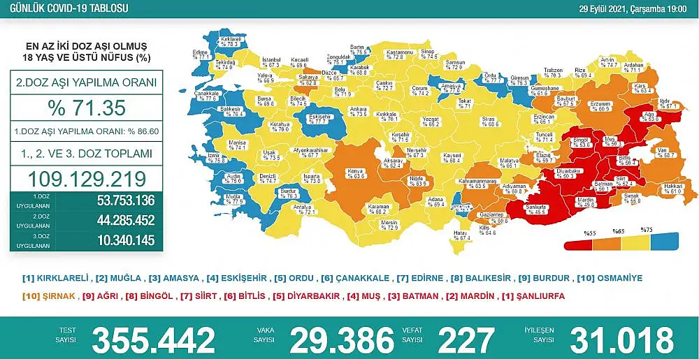 Covid-19'a karşı İKİNCİ DOZ aşı oranı Malatya'da yüzde 65'in üzerinde çıktı.Günbegün Covid-19 vaka sayılarını paylaşan Sağlık Bakanı Dr. Fahrettin koca, 29 Eylül 2021 gününe ait rakamları duyurdu.