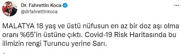 Bakan Koca söz konusu paylaşımında, “Malatya'da 18 yaş ve üstü nüfusun en az bir doz aşı olma oranı yüzde 65’in üstüne çıktı. Covid-19 Risk Haritasında bu ilimizin rengi Turuncu yerine Sarı” ifadelerine yer verdi.