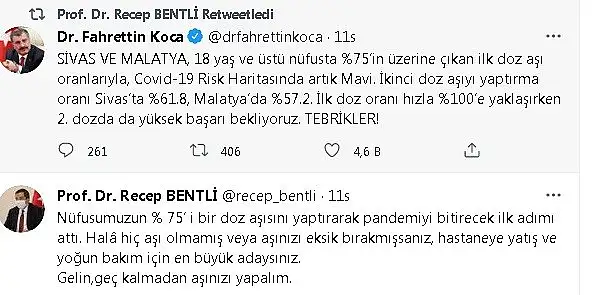 Bakan Koca, Malatyalıları sevindiren paylaşımında, “Sivas ve Malatya, 18 yaş ve üstü nüfusta yüzde 75’in üzerine çıkan ilk doz aşı oranlarıyla, Covid-19 Risk Haritasında artık Mavi. İkinci doz aşıyı yaptırma oranı Sivas’ta yüzde 61.8, Malatya’da yüzde 57.2. İlk doz oranı hızla yüzde 100’e yaklaşırken 2. dozda da yüksek başarı bekliyoruz. Tebrikler” ifadelerini kullandı.