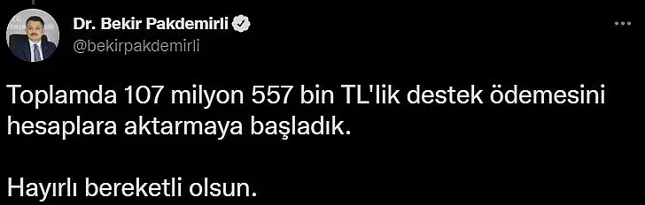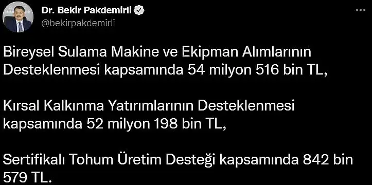 Bakan Pakdemirli, sosyal medya hesabından yaptığı paylaşımda, “Bireysel Sulama Makine ve Ekipman Alımlarının Desteklenmesi kapsamında 54 milyon 516 bin lira, Kırsal Kalkınma Yatırımlarının Desteklenmesi kapsamında 52 milyon 198 bin lira, Sertifikalı Tohum Üretim Desteği kapsamında 842 bin 579 lira, toplamda 107 milyon 557 bin TL'lik destek ödemesini hesaplara aktarmaya başladık. Hayırlı bereketli olsun” ifadelerine yer verdi.