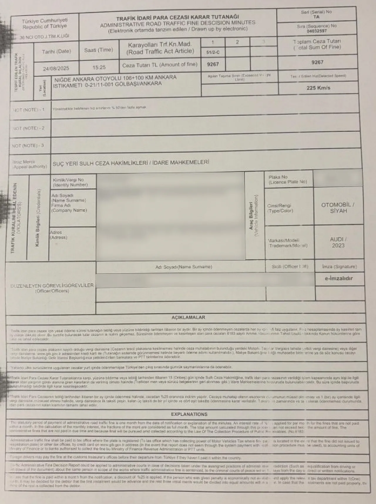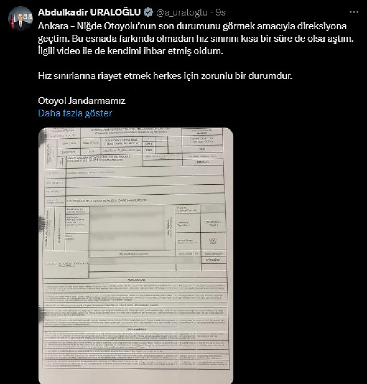 Ulaştırma ve Altyapı Bakanı Abdulkadir Uraloğlu, Ankara–Niğde Otoyolu'nda yaptığı inceleme sırasında hız sınırını aştığını belirterek kamuoyuna açıklamada bulundu.