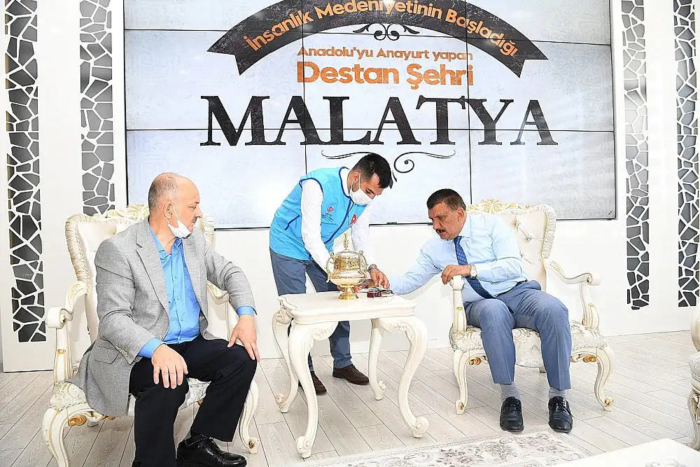 İl Müftüsü Veysel Işıldar’ın ziyaretinde kurban bağışını yapan Başkan Gürkan, çalışmalarından dolayı Diyanet İşleri Başkanlığı ve Diyanet Vakfı’na teşekkür etti. Malatya İl Müftüsü Veysel Işıldar, Büyükşehir Belediye Başkanı Selahattin Gürkan’ı makamında ziyaret etti. Ziyarette Kurban Bayramı dolayısıyla kestireceği Kurban’ını Diyanet Vakfı’na bağışlayan Başkan Gürkan, “Vakfımızın gerek yurt içinde gerekse yurt dışında mazlum, masum, düşkün; ihtiyaç sahibi insanlar için hazırlamış olduğu program çerçevesinde yapılan bağışlar devletimizin teminatıyla ilgili yerlere gidecek” dedi.