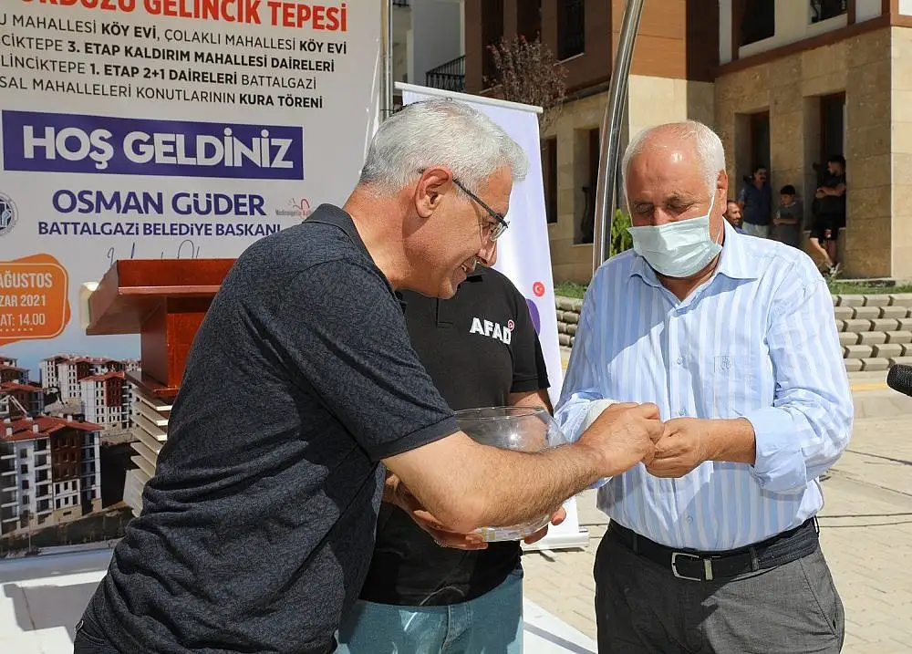 24 Ocak depreminde Battalgazi’de evleri yıkılan ve ağır hasar gören aileler için Çevre ve Şehircilik Bakanlığı’nın öncülüğünde Toplu Konutlar İdaresi Başkanlığı (TOKİ) tarafından Bulutlu ve Çolaklı mahallelerinde inşası tamamlanan 28 adet köy evleri ile Gelincik Tepesi’nde yapılan 1.etap 38 konut ve 3.etap 15 konutun anahtar teslimi için kura töreni düzenlendi.