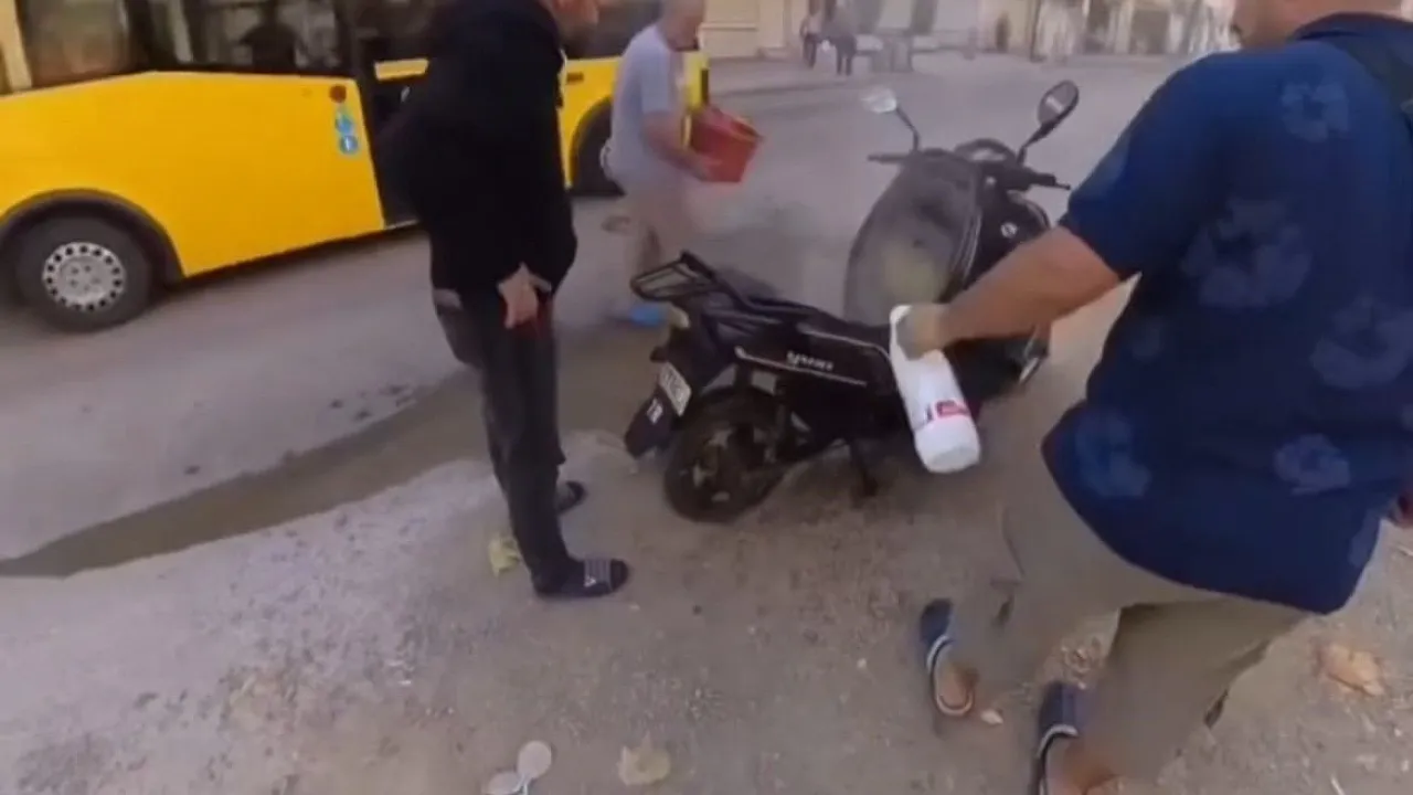 Yangın sırasında çevrede bulunan bir kişi, etrafta yangın tüpü aramak yerine zaman kaybetmeden vileda kovasına su doldurarak motosiklete koştu. Kovadaki suyu doğrudan alevlerin üzerine boşaltan vatandaş, yangını büyümeden söndürmeyi başardı.