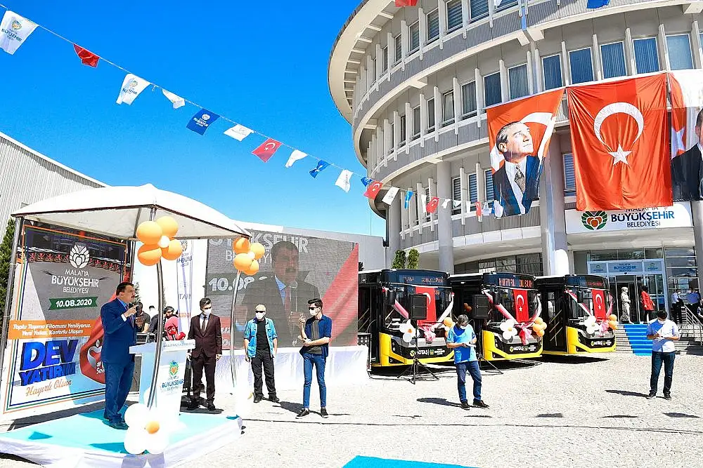 Toplam 139 otobüs, 22 trambüsle Malatyalıları taşıyan Büyükşehir Belediyesi, 15 yeni otobüsün hizmete sunulması nedeniyle tören düzenledi. Geçtiğimiz günlerde 88 iş makinesi ve araç bünyesine katan Büyükşehir Belediyesi, 15 yeni otobüs ve Eylül ayında teslim edilecek 5 körüklü otobüsle araç filosunun yüzde 50’sini yenilemiş olacak.