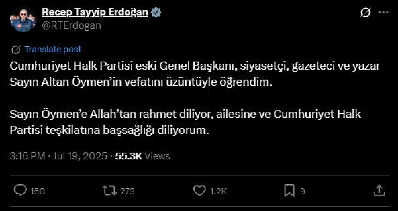 Cumhurbaşkanı Recep Tayyip Erdoğan, eski Cumhuriyet Halk Partisi (CHP) Genel Başkanı Altan Öymen'in vefatı nedeniyle taziye mesajı yayımladı.