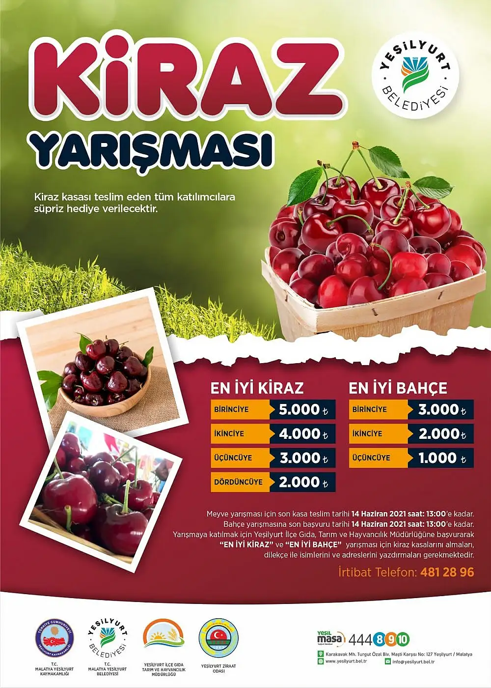 Yeşilyurt Kaymakamlığı, Yeşilyurt Belediyesi, Yeşilyurt İlçe Gıda Tarım ve Hayvancılık Müdürlüğü ile Yeşilyurt Ziraat Odası işbirliği ile düzenlenen ‘En İyi Kiraz’ ve ‘En İyi Kiraz Bahçesi’ yarışmasına katılan üreticiler, dalbastı kirazlarını jüri heyetine teslim ettiler.