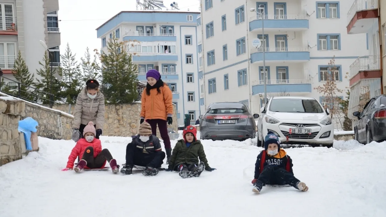 Malatya'nın Darende ilçesinde kar yağışı sonrası tatili de fırsat bilen çocuklar, evlerden getirdikleri tepsilerin üzerinde kayarak karın keyfini çıkardı.
