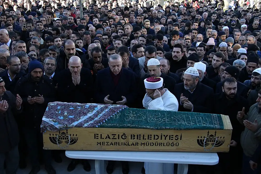 Elazığ’da dün akşam saatlerinde meydana gelen 6,8 büyüklüğündeki deprem nedeniyle Cumhurbaşkanı Recep Tayyip Erdoğan kente geldi. Erdoğan, İlk önce depremde hayatını kaybeden 9 yaşındaki Muhammed Salih ile annesi Ayşe Civelek’in Mevlana Camisi’nde düzenlenen cenaze namazına katıldı. Diyanet İşleri Başkanı Ali Erbaş’ın kıldırdığı cenaze namazına Cumhurbaşkanı Erdoğan’ın yanı sıra bakanlar, il protokolü, hayatını kaybedenlerin yakınları ve çok sayıda vatandaş katıldı.