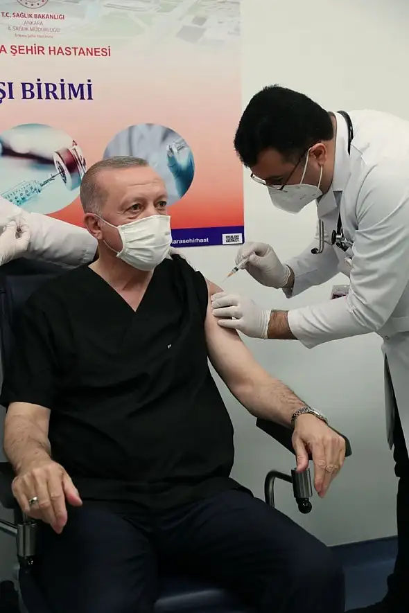 Cumhurbaşkanı Erdoğan, Ankara Şehir Hastanesi'ne gelerek koronavirüs aşısının ilk dozunu oldu. Erdoğan 28 gün sonra ikinci dozu olacak. Kovid-19 aşısının ilk dozunu olduktan sonra açıklama yapan Cumhurbaşkanı Erdoğan, "Aşılarımız gelir gelmez, bakanımız 'ilk aşıyı ben yaptıracağım' dedi ve ilk aşıyı yaptırdı. Bilim Kurulu üyelerimiz yaptırdı. Ben de 'aşıyı yaptıracağım' demiştim. Ben ve MYK'daki arkadaşlarımız da buradaki aşıları yaptırdık yaptırıyoruz" ifadelerini kullandı