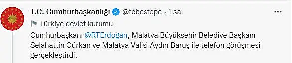 Cumhurbaşkanı Recep Tayyip Erdoğan, Malatya Büyükşehir Belediye Başkanı Selahattin Gürkan ve Malatya Valisi Aydın Baruş ile telefon görüşmesi gerçekleştirdi.