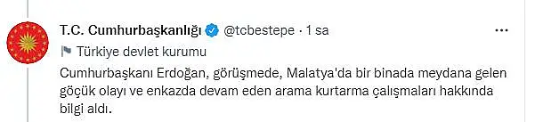 Cumhurbaşkanlığı İletişim Başkanlığından yapılan açıklamaya göre, Cumhurbaşkanı Erdoğan görüşmede, Malatya'da bir binada meydana gelen göçük olayı ve enkazda devam eden arama kurtarma çalışmaları hakkında bilgi aldı.