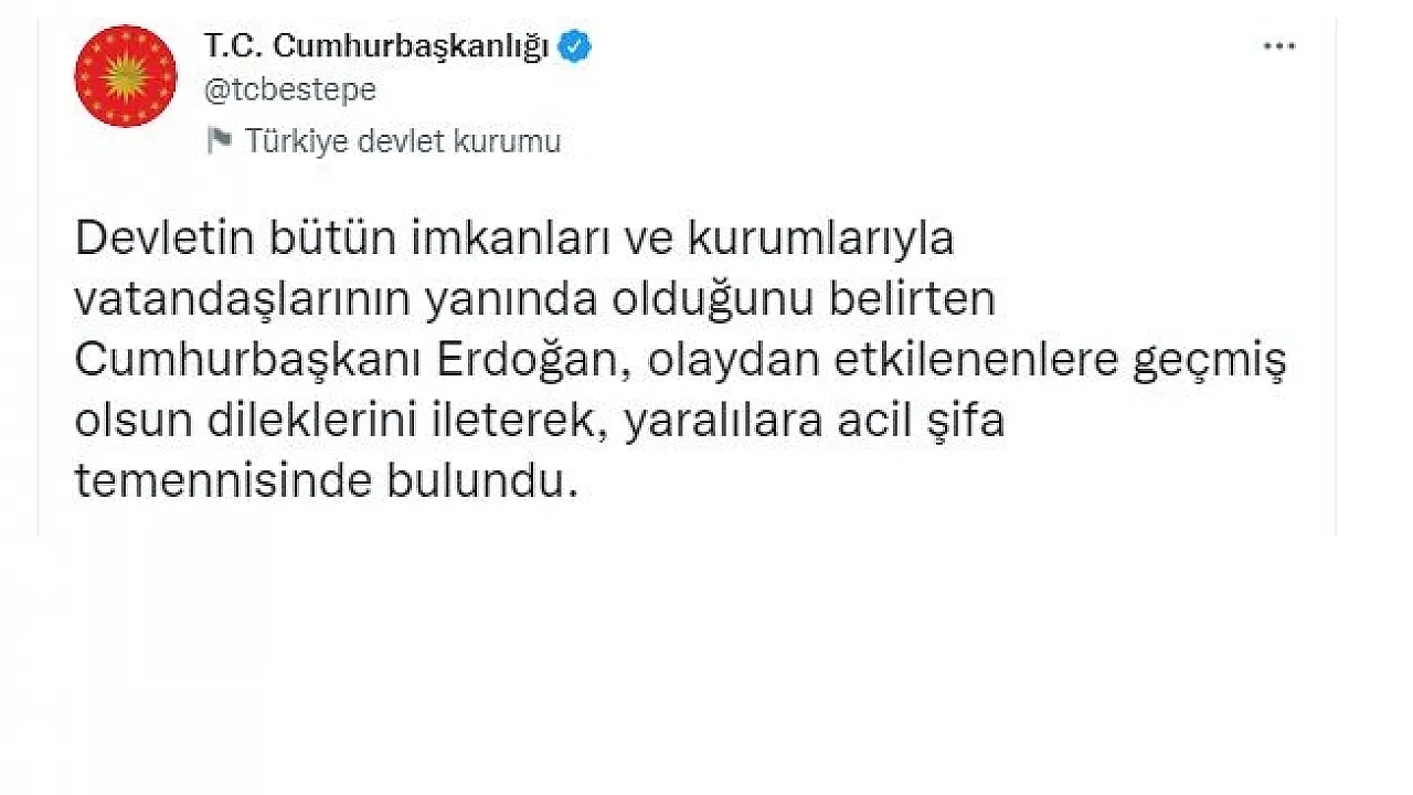 Devletin bütün imkanları ve kurumlarıyla vatandaşlarının yanında olduğunu belirten Cumhurbaşkanı Erdoğan, olaydan etkilenenlere geçmiş olsun dileklerini ileterek, yaralılara acil şifa temennisinde bulundu.