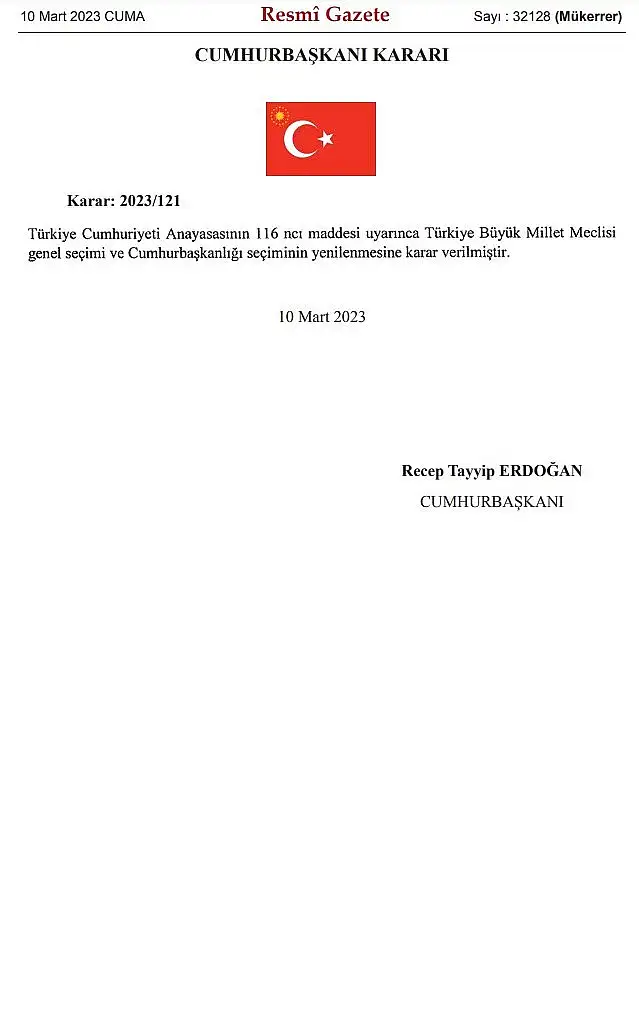 Resmi Gazete'de 2023/121 sayılı Cumhurbaşkanı Kararı ile Türkiye Cumhuriyeti Anayasası'nın 116. maddesi uyarınca Türkiye Büyük Millet Meclisi (TBMM) genel seçimi ve Cumhurbaşkanlığı seçiminin yenilenmesine karar verildiği yayımlandı.