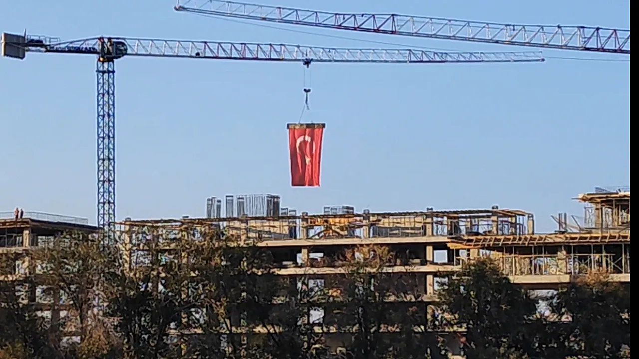 Malatya’da 29 Ekim Cumhuriyet Bayramı öncesi dikkat çeken bir görüntü ortaya çıktı. Battalgazi ilçesinde, eski hal binası alanında devam eden ticaret bölgesi inşaatında görev yapan bir vinç operatörü, bayramı farklı bir şekilde kutladı. Operatör, vinç ucuna astığı dev Türk bayrağını akşam saatlerinde gökyüzünde dalgalandırarak kutlamaya anlam kattı.