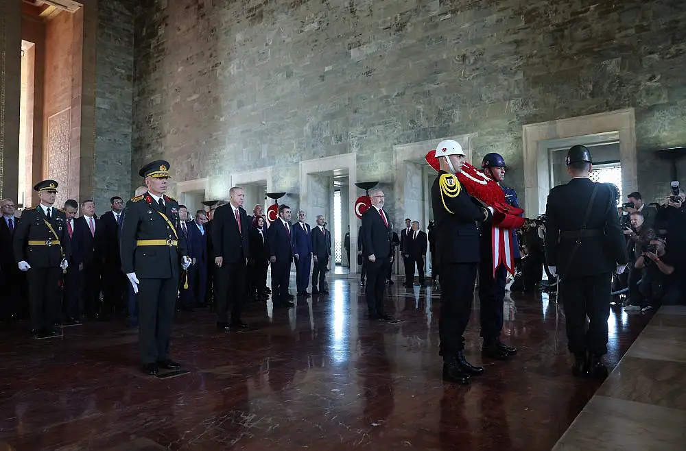 Cumhurbaşkanı Erdoğan'ın üzerinde ay yıldız bulunan çelengi Atatürk'ün mozolesine bırakmasının ardından saygı duruşunda bulunuldu ve İstiklal Marşı okundu.