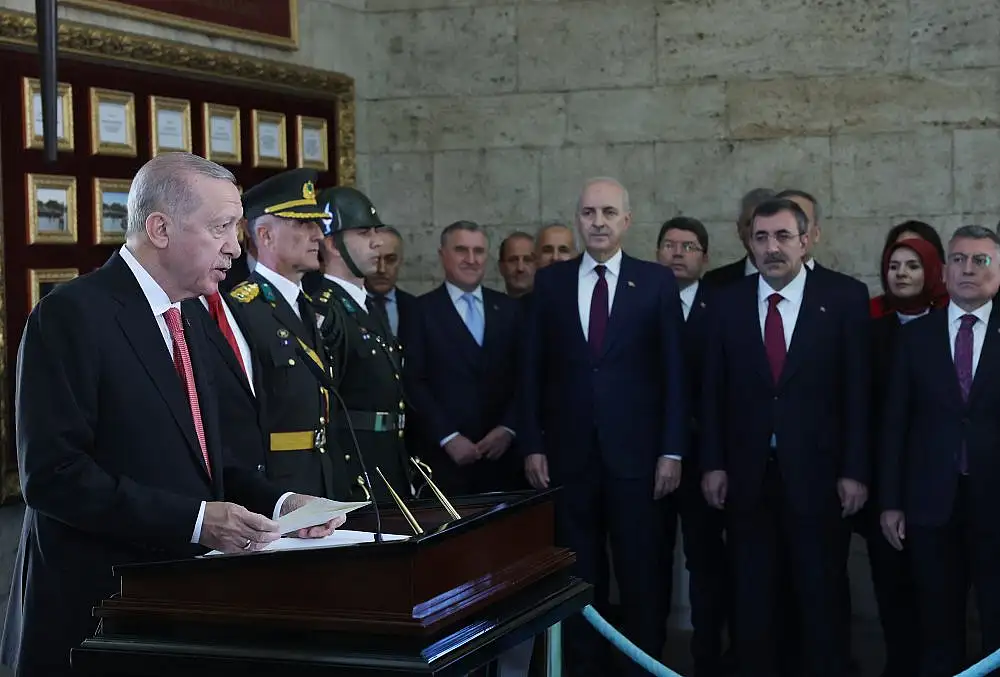 Cumhurbaşkanı Erdoğan'ın Aslanlı Yol'un başındaki yerini almasının ardından başlayan törende, Türkiye Büyük Millet Meclisi Başkanı Numan Kurtulmuş, Cumhurbaşkanı Yardımcısı Cevdet Yılmaz, CHP Genel Başkanı Özgür Özel, MHP Genel Başkanı Devlet Bahçeli, Cumhurbaşkanlığı Kabinesi üyeleri, Yüksek Yargı üyeleri, Genelkurmay Başkanı Orgeneral Metin Gürak ve kuvvet komutanları da Aslanlı Yol'dan geçerek mozoleye çıktı.