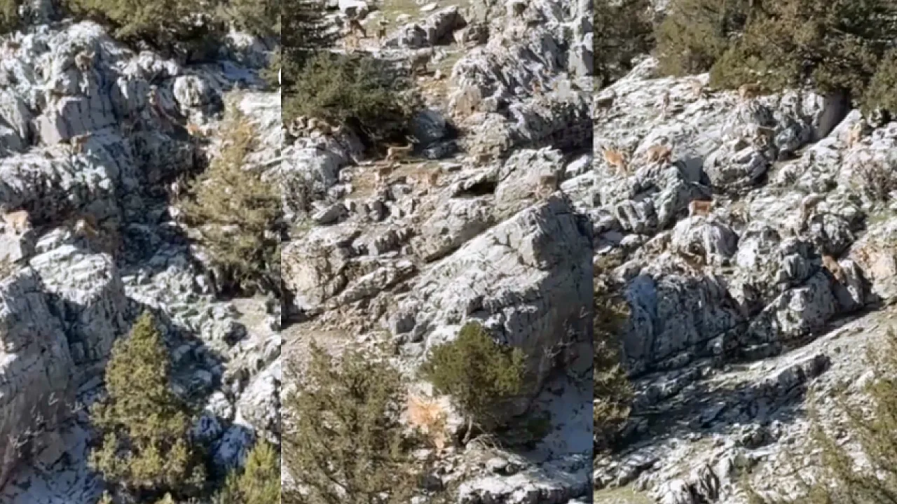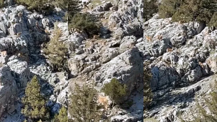 Malatya'nın Doğanşehir ilçesinde doğanın eşsiz manzaralarından biri kameralara yansıdı. Sarp kayalıkların ev sahipliği yaptığı yaban keçileri, bölgedeki bir vatandaşın dikkatinden kaçmadı.