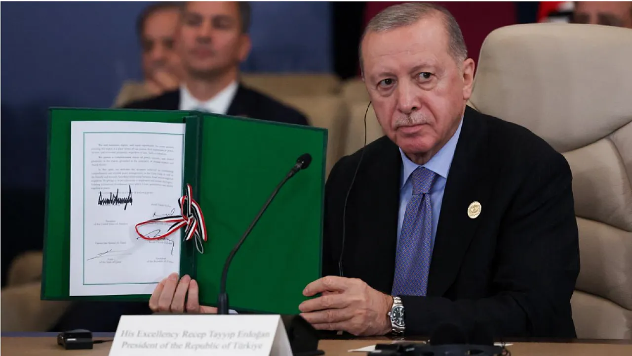 Cumhurbaşkanı Recep Tayyip Erdoğan, Mısır'da düzenlenen Şarm el-Şeyh Anlaşması imza törenine katıldı. Törende ABD Başkanı Donald Trump ve Mısır Cumhurbaşkanı Abdulfettah es-Sisi ile bir araya gelen Erdoğan, anlaşmayı imzalayan liderler arasında yer aldı.