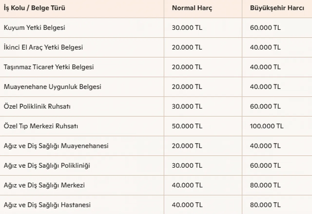 Ayakta teşhis ve tedavi hizmeti sunan özel sağlık kuruluşları ile ağız ve diş sağlığı merkezlerine ait belgeler, veteriner hekim muayenehane ve poliklinikleri, hayvan hastaneleri, kıymetli maden kuruluş ve faaliyet izin belgeleri, kuyumculuk, ikinci el araç ve taşınmaz ticareti yetki belgeleri ile havacılık işletme ruhsatları artık yıllık harca tabi olacak.