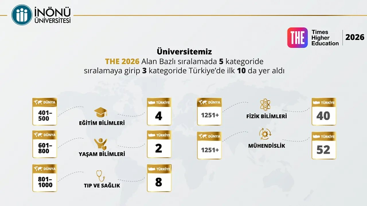 İnönü Üniversitesi, Times Higher Education (THE) 2026 Alan Bazlı Sıralamalarında 5 farklı kategoride yer alarak ulusal ve uluslararası ölçekte dikkat çekici bir başarıya imza attı. Üniversite, bu kategorilerin üçünde Türkiye genelinde ilk 10 içerisinde bulunarak akademik gücünü bir kez daha ortaya koydu.