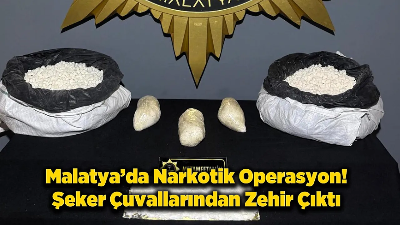 - • Malatya'da 9 Nisan 2026 tarihinde durdurulan bir araçta, şeker çuvalları arasına saklanmış 3 kilo 30 gram metamfetamin ele geçirildi.