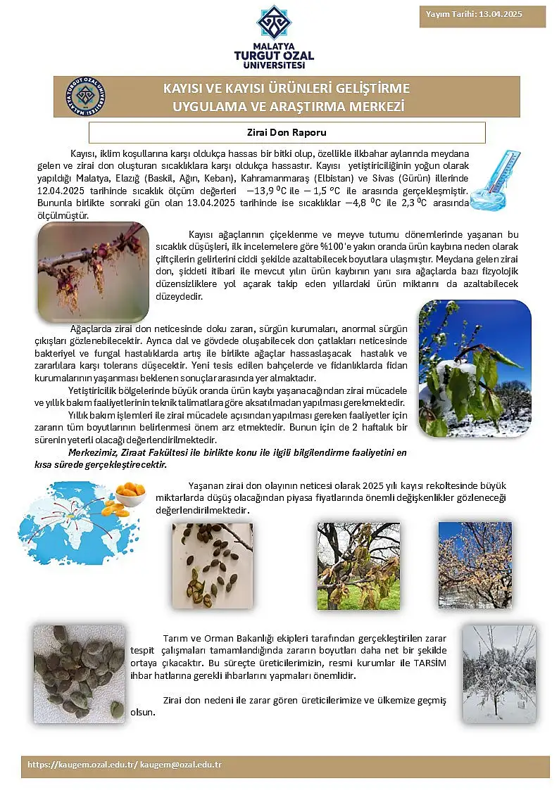 Malatya Turgut Özal Üniversitesi Kayısı ve Kayısı Ürünleri Geliştirme Uygulama ve Araştırma Merkezi tarafından Zirai Don Raporu açıklandı.